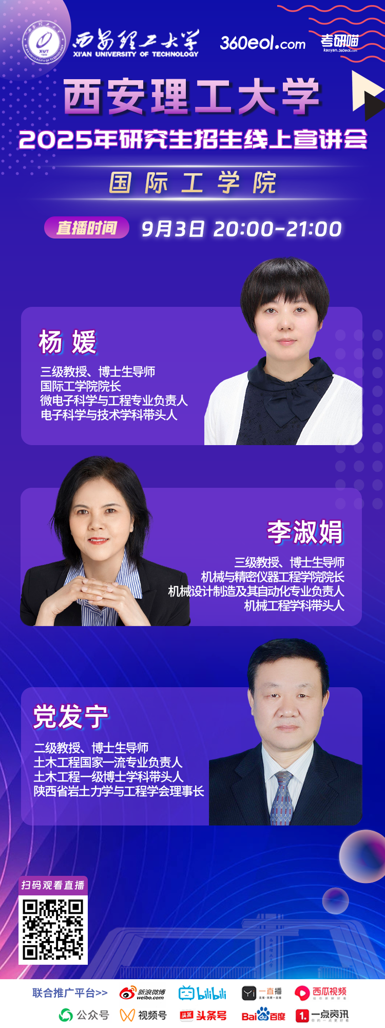 9月3日(周二)威廉体育williamhill经理杨媛教授、机械与精密仪器工程公司经理李淑娟教授、土木工程国家一流专业负责人党发宁教授,为你全方位解读威廉体育官方网站中外合作办学中研究生招生和培养的重点内容,届时将有公司概况、硕士和博士研究生的招生政策、机械工程学科方向和特色、土木水利学科特色和优势学科方向、公司产品过程、学科团队实力、科学研究平台等内容,诚邀各位考生、家长扫描海报图中的二维码进行线上观看!