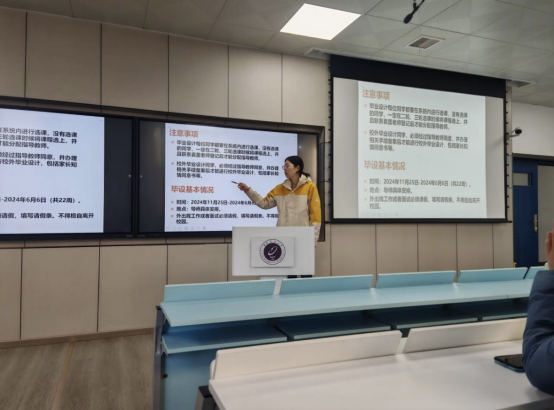 袁蕾首先为同学们介绍了2020级毕业设计的整体情况,重点介绍了存在的问题以及同学们可以进一步改进提升的方向,强调了毕业设计对于本科教育阶段的重要意义。随后,又分别从整体时间节点安排、考勤纪律、提交材料等方面进行了详细的介绍与要求。希望同学们能够与指导教师保持密切联系,确保从精准选题到最终毕业论文提交的每一步都能认真仔细高质量的完成。